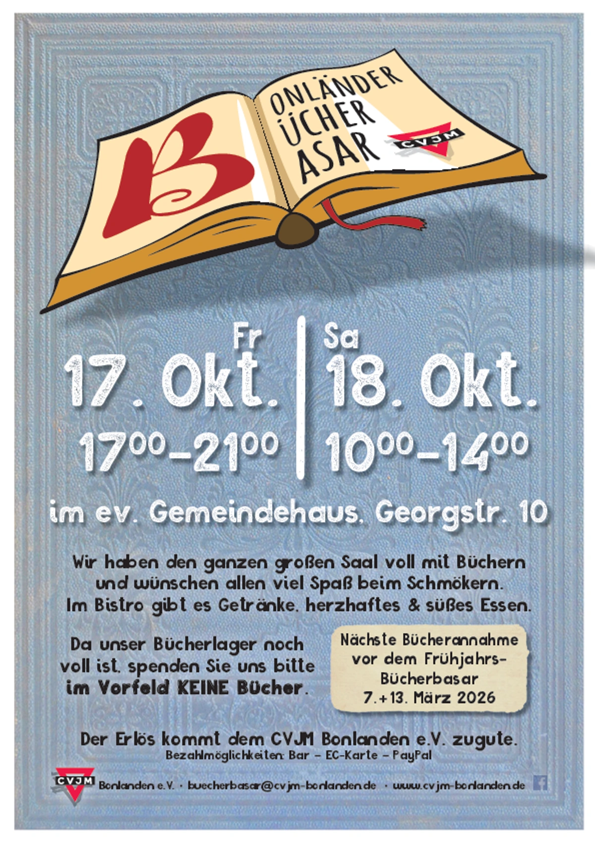 Am 17. und 18. Oktober findet wieder unser Bonländer Bücherbasar statt. Es wird jede Menge Bücher geben, die zum Zentimeter-Preis verkauft werden. An beiden Tagen wird es im Bistro auch was zum Essen und Trinken geben.