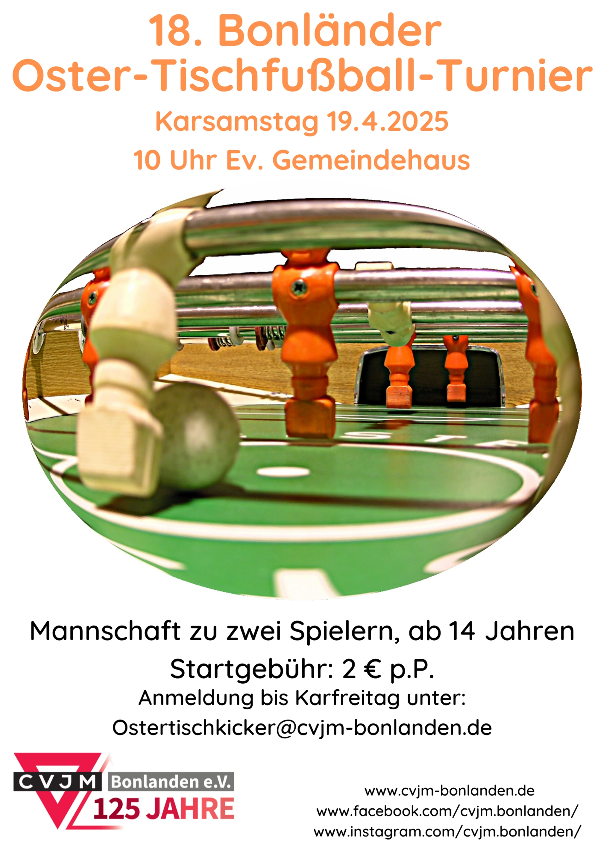 Das Tischkickerturnier findet jedes Jahr am Karsamstag statt. Eine Anmeldung ist unter der E-Mail-Adresse Ostertischkicker@cvjm-bonlanden.de bis zum Karfreitag notwendig.